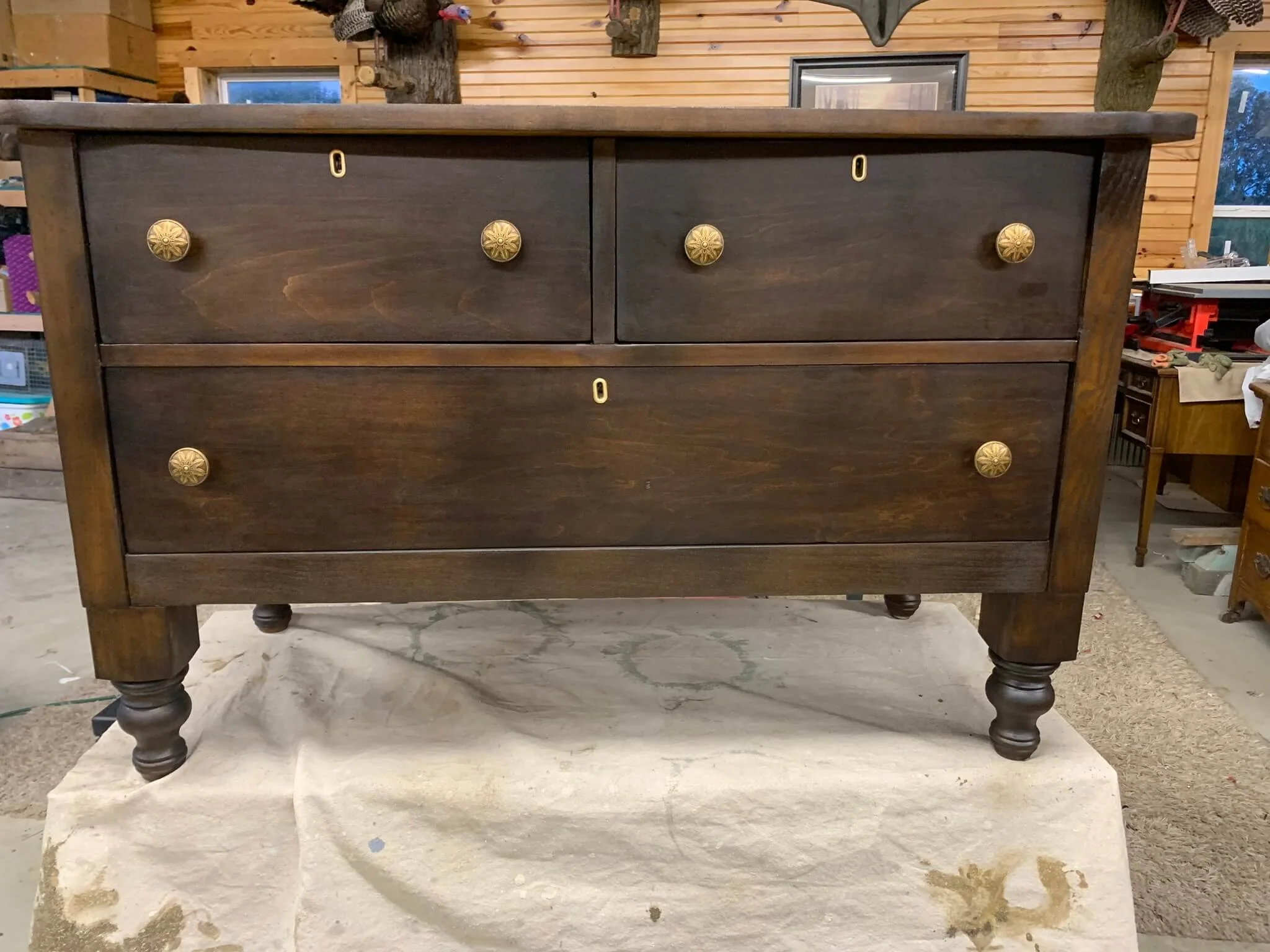 Next came an old buffet that should have been thrown away. But Karen worked her magic & turned it into a TV/entertainment stand. It is gorgeous and the focal point in our living room.