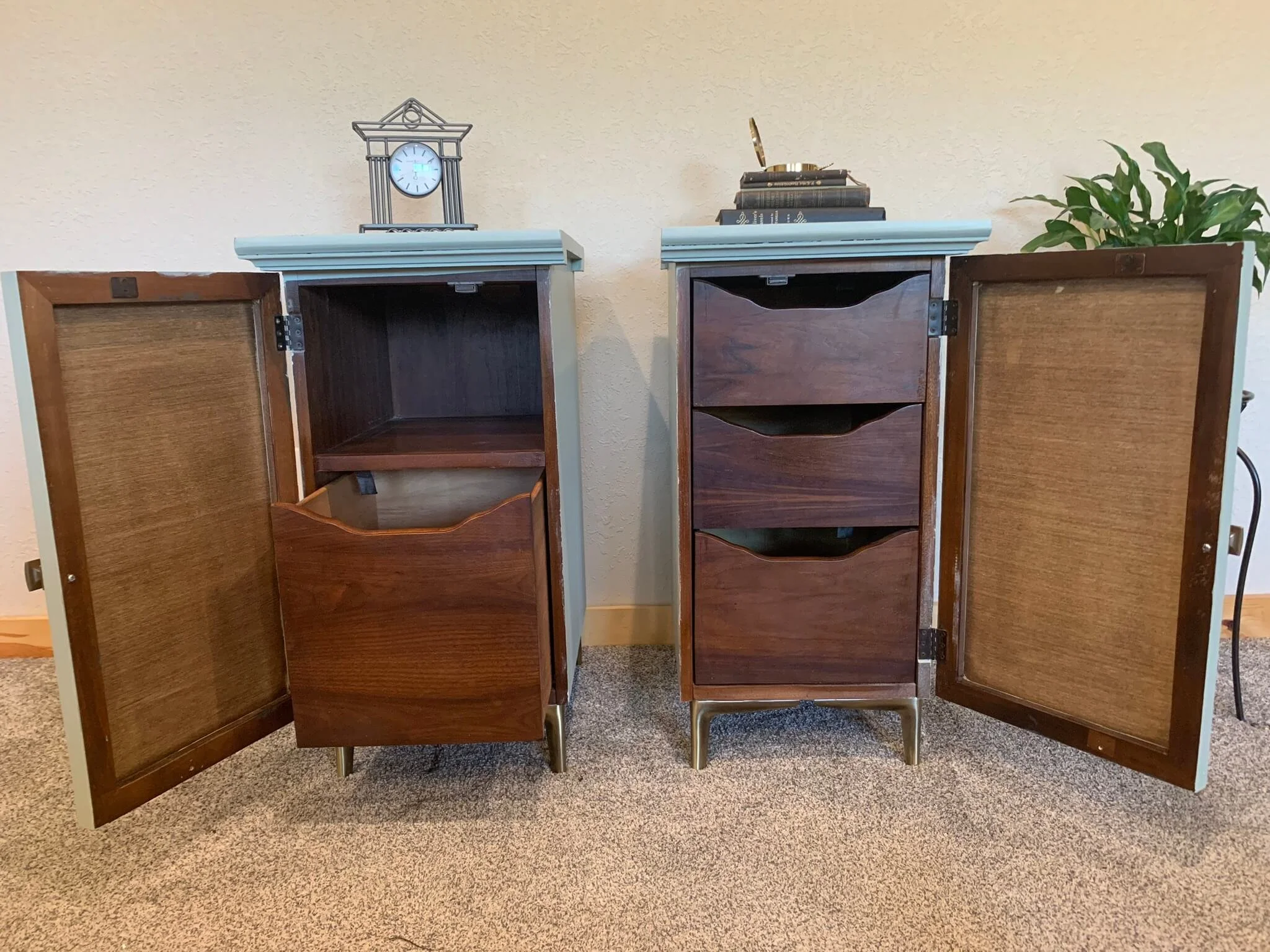 This vintage filing cabinet duo blends functionality with modern flair. The deep walnut interior and drawers provide rich contrast to the soft mint exterior, while brass-toned feet add a hint of retro charm. Perfect for a stylish home office, these cabinets are proof that storage can be both practical and beautiful.