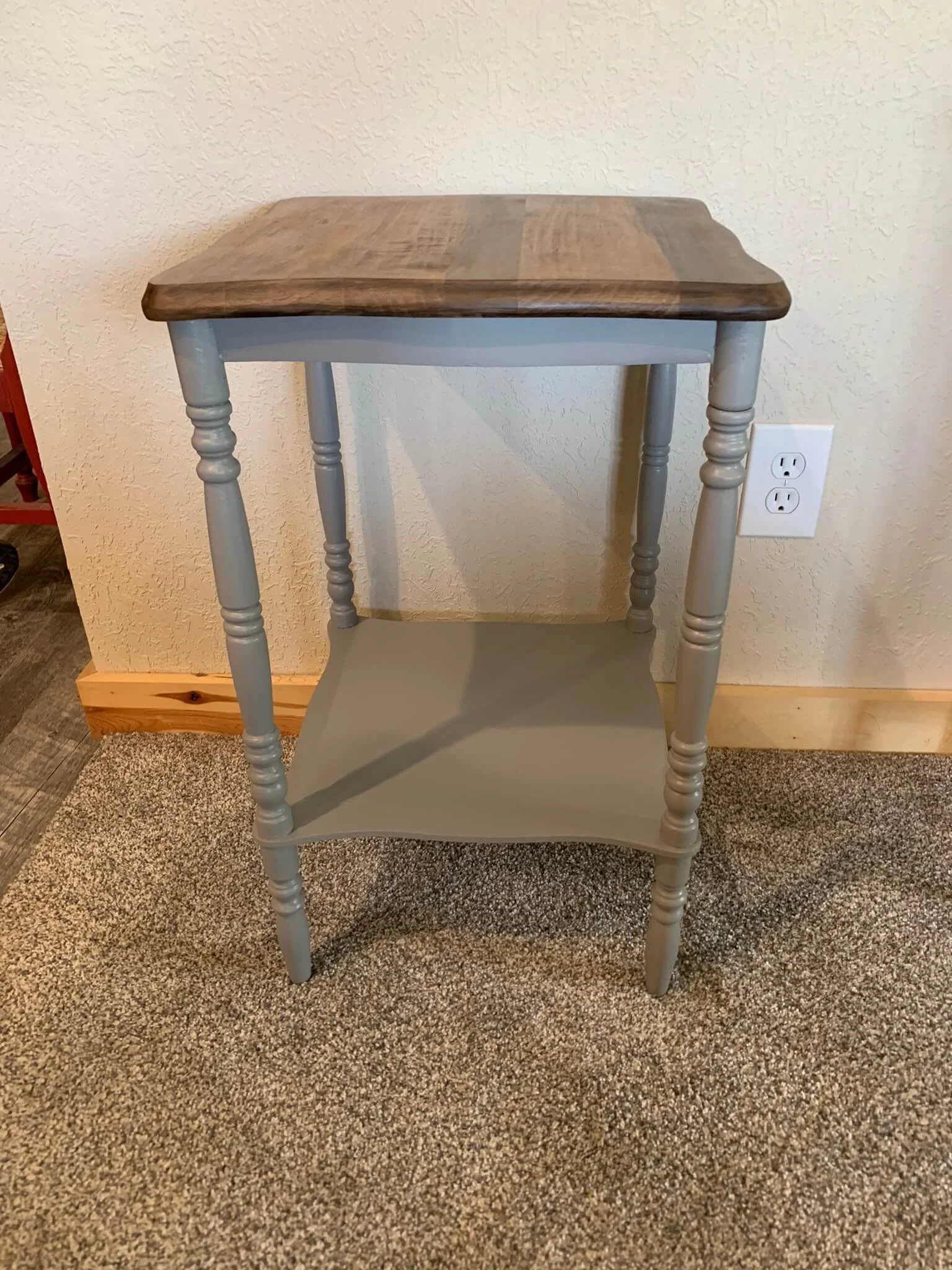 This charming side table features turned legs in a soft grey satin finish, paired with a natural wood top that highlights its beautiful grain. The gently curved lower shelf adds extra function and style, making it perfect for holding books, plants, or a cozy cup of tea. A timeless piece that blends farmhouse charm with a modern touch.